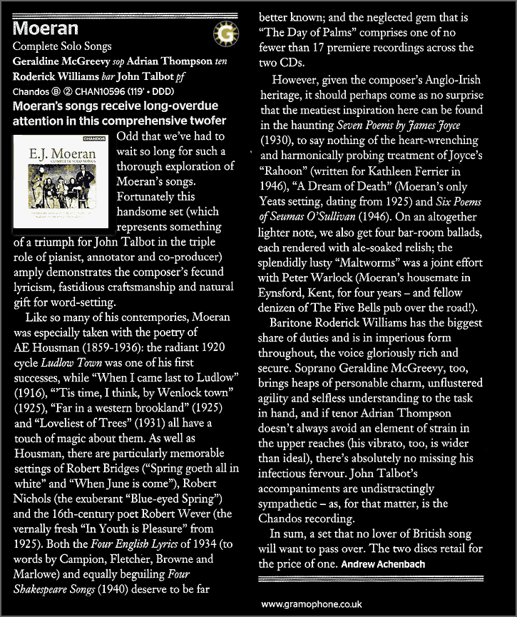 "With his considerable research into Moeran and his skill as a pianist and accompanist, it is unlikely that a more persuasive advocate of these songs could be found than John Talbot. His devotion to the music, evident in his published edition of them, added to the singers’ innate experience and total involvement, has produced performances of great character and beauty."
